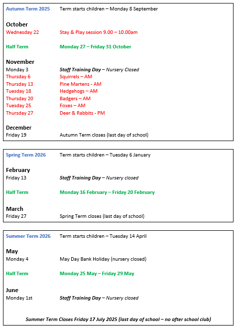 We are holding a Stay and Play morning for you to come and join your children playing in nursery. This will be on Wednesday 22 October from 9.00 till 10.00am.